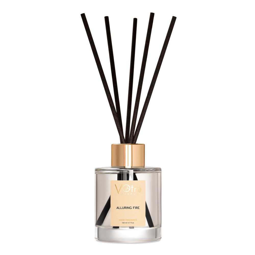 Спальня, наповнена ароматом манго і персика, стане місцем хвилюючих прелюдій. Все тому, що тут буде дифузор Alluring fire. Гарний дифузор від бренду Votre Parfum наповнить будинок прекрасним ароматом. Cтане стильною прикрасою інтер’єру. Прозора скляна колба. Гладка, без єдиного зайвого елемента + комплект чорних бамбукових паличок.